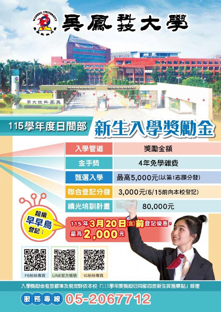 入學獎勵金發放標準及規定詳依本校「115學年度獎勵日間部四技新生實施要點」辦理